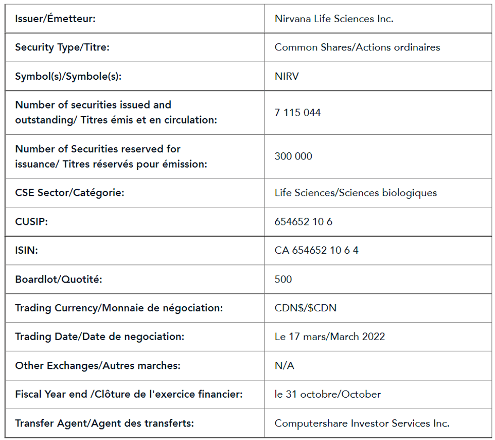 The common shares of Nirvana Life Sciences Inc., have been approved for listing on the CSE.