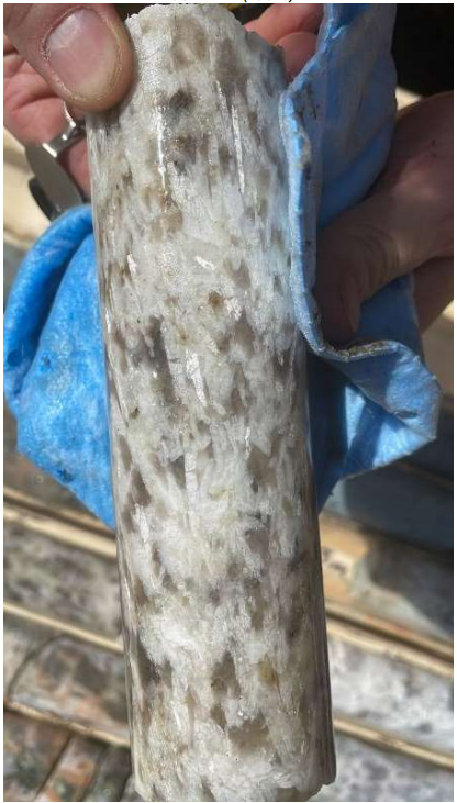 Figure 1: Close up images of large white-cream coloured spodumene crystals intercepted in Hole MF22-72 (Hole 13)