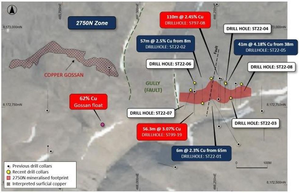 ST22-02 was drilled to a downhole depth of 155m and was designed to test the continuity of the copper mineralisation in the central 2750N Zone (Figure 1).