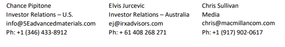 5E Advanced Materials, Inc. (Nasdaq: FEAM) (ASX: 5EA) (“5E,” “We,” “Our,” or the “Company”) has entered into a non-binding letter of intent (“LOI”) with Corning Incorporated (NYSE: GLW) (“Corning”) to supply boron specialty materials. Under the terms of the LOI, 5E and Corning will work towards a binding agreement for the supply of boron specialty and advanced materials, which are used in the manufacture of Corning’s products. 5E and Corning will also collaborate and share technical know-how for the purpose of developing and enhancing boron advanced materials.