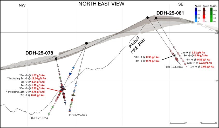 - DDH 25-078 returned several high-grade gold intercepts within a ~100-metre-thick mineralized package, including: