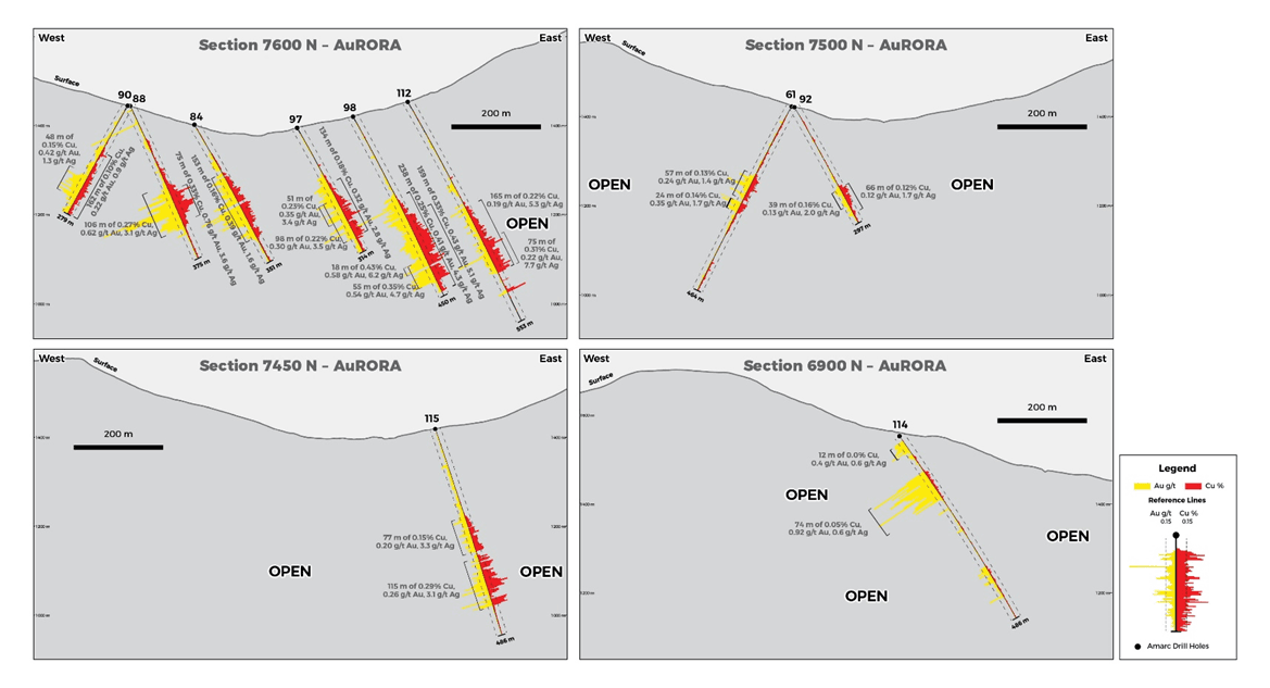 Figure 4 (Sections 7600N, 7500N, 7450N and 6900N): AuRORA Deposit Discovery 2025 Step-Out Drilling is Discovering More Open-Ended, Continuous Mineralization