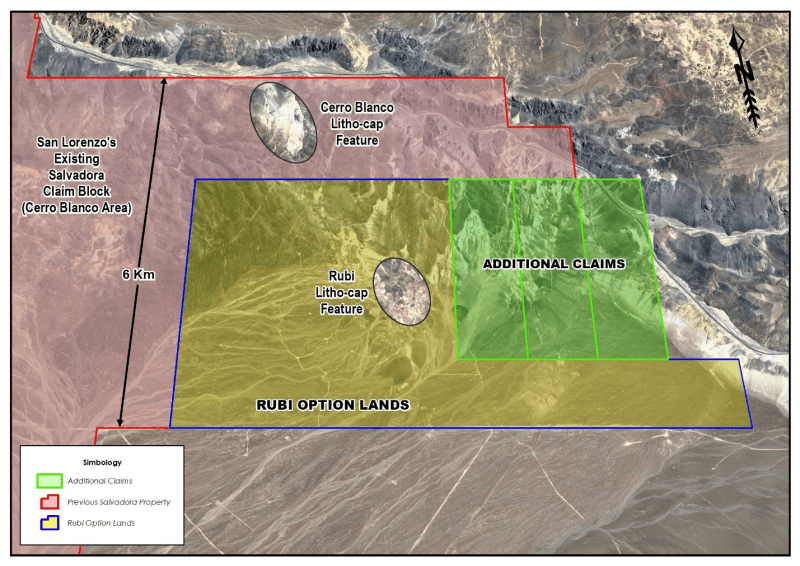 The lands were added on the eastern side of San Lorenzo's Salvadora property, where the Cerro Blanco porphyry target is located - as shown on Figure 1 below.