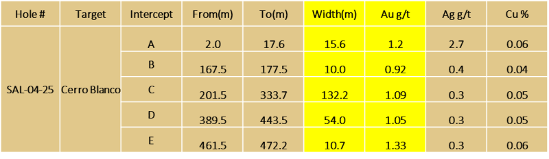 2)Confirm the interpretation that the mineralization is sub-vertical as can be witnessed on the valley floor 1.7 km to the north of hole SAL 04-25.