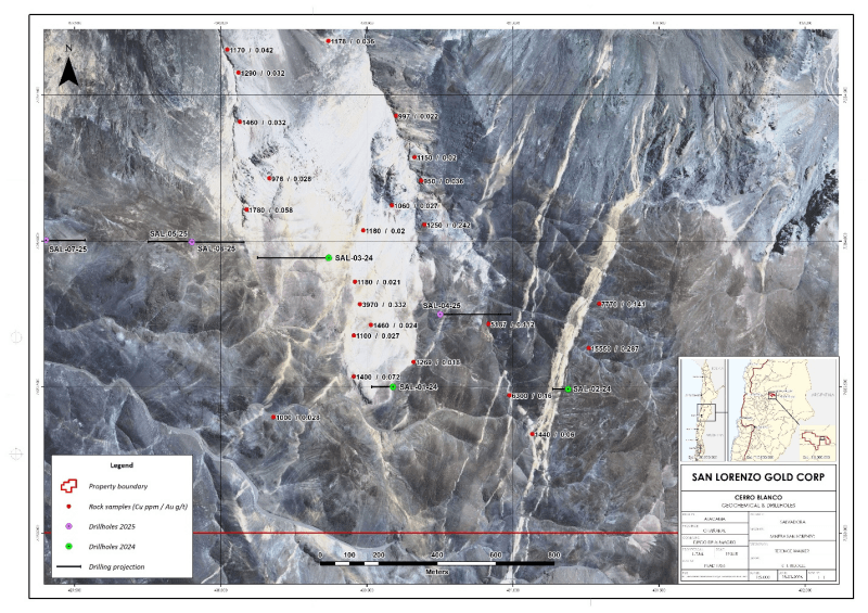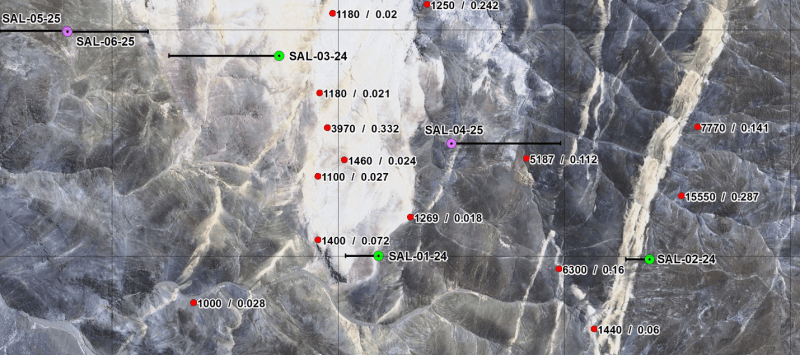 San Lorenzo has drilled 3 holes on the eastern side of the Cerro Blanco litho-cap feature (northernmost circle on Figure 1). Two of those holes were drilled in the 2024-2025 program (holes SAL 01-24 and SAL 02-24). The third hole (SAL 04-25), the first hole in the current program, was drilled on an in-fill IP line obtained during the most recent (summer 2025) IP program. A fourth hole on the east side of the litho-cap feature was planned to test the strongest IP conductivity/resistivity anomaly identified to date, which is located on the eastern end of the northernmost IP line. That hole has not yet been drilled due to terrain limitations. However, it is scheduled to be drilled in the near future. The locations of the 3 holes that have been drilled are illustrated on the figures below which include their related IP lines and their locations relative to those IP lines - the only IP lines run by San Lorenzo to date. Insofar as IP has been proven to be a very useful exploration tool on the Salvadora property, San Lorenzo is actively planning an IP program that will provide additional data both north - and now to the south as well - of the existing IP lines. It is intended that additional drilling will follow IP. Drilling is targeted to: