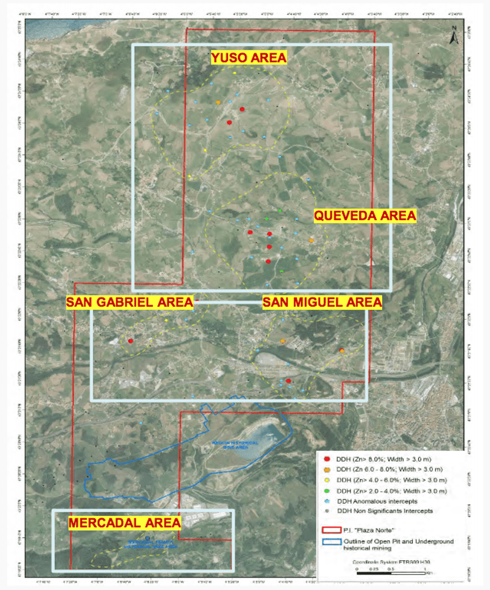 - Plaza Norte project is adjacent to the past-producing Reocin mine and hosts mineralization extensions from the mine.