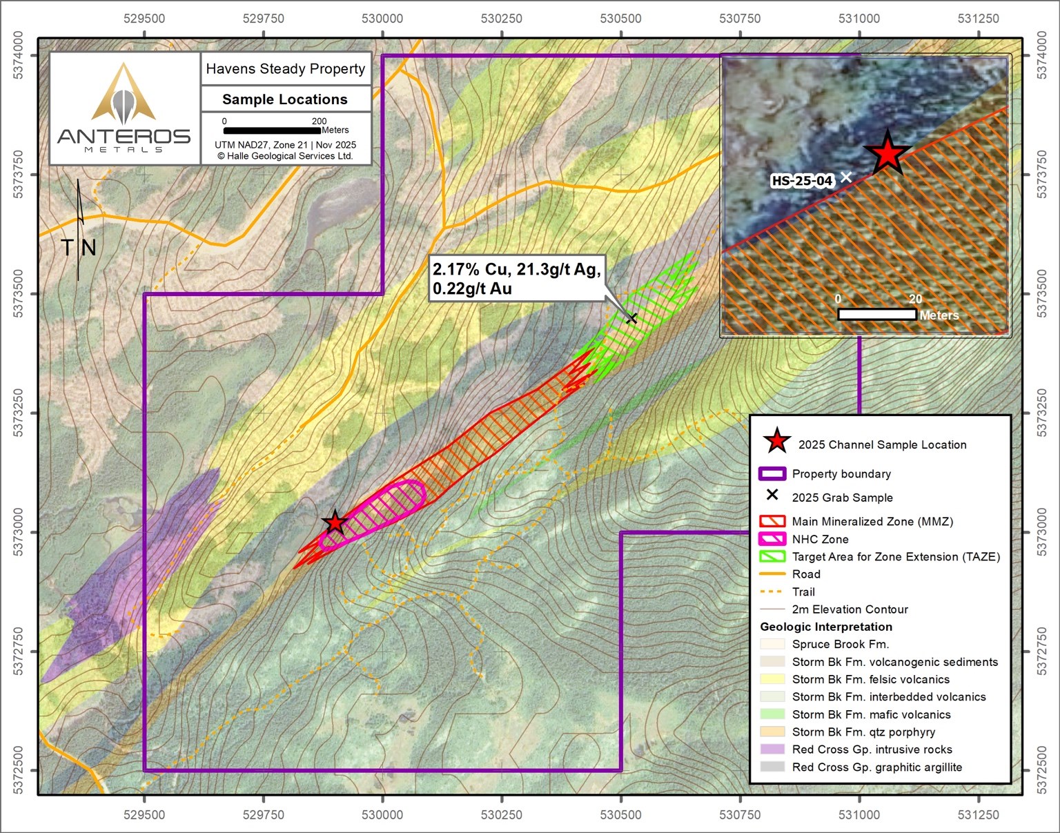 Anteros Metals Inc. (CSE: ANT) ("Anteros" or the "Company") is pleased to report results from its first channel sampling program, which expands surface polymetallic mineralization at the Main Mineralized Zone ("MMZ") of its wholly-owned, road-accessible Havens Steady VMS Property ("Havens Steady" or the "Property") in central Newfoundland. This work confirms and extends near-surface lead-zinc-silver-gold-copper mineralization first modelled within the NHC Zone (see May 1, 2025 News Release) and later validated by high-grade grab samples (see July 03, 2025 News Release). Together, these results indicate the continuity of mineralization along approximately 750 metres of strike, consistent with the interpretation of a broad, near surface VMS-style system. The Company plans to continue channel sampling programs along the modelled MMZ trend and within the Target Area for Zone Extension ("TAZE") identified in Figure 1.