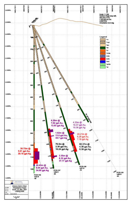 Greg Hahn V.P. Exploration comments:" The Perry discovery continues to be well mineralized and extends a further 60m north from the last reported hole. Vein textures continue to indicate we are still only at the top of the boiling zone of this impressive system. It is my objective to continue to push out the Perry strike length both to the north and south to demonstrate the scale of the mineralized structure. We know the host structure (generally known as the Arabian Fault) extends for +3 kilometres. We need to determine how much of that structure, which lies entirely within Arizona Gold & Silver property, is well mineralized. The potential scale of this discovery both along strike and to depth is very significant. I look forward to seeing the intercept in hole PC25-159, currently in progress."