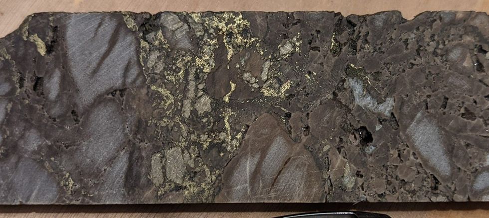 Figure 7: Chalcopyrite (copper sulfide), pyrite (iron sulfide), sphalerite (zinc sulfide) and galena (lead sulfide) within vuggy bituminous dolostone in ST22-10 drill core from 313m downhole.