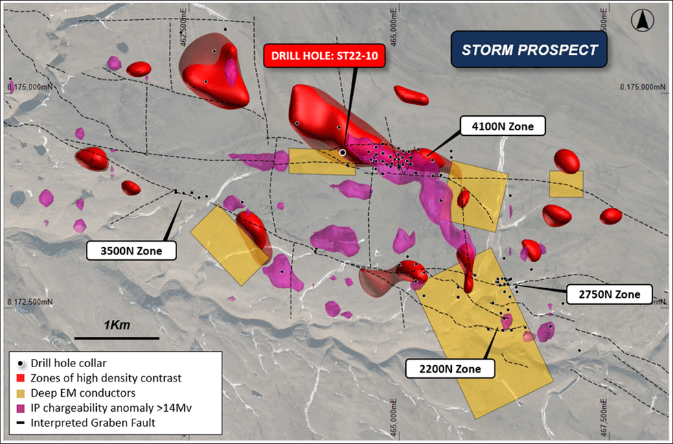 Exploration drill hole ST22-10 was completed in 2022 targeting a large EM anomaly to the west of, and at a deeper stratigraphic level than, the near-surface high-grade 4100N Zone. The EM anomaly is located on the southern edge of a strong airborne gravity anomaly associated with the northern graben fault.