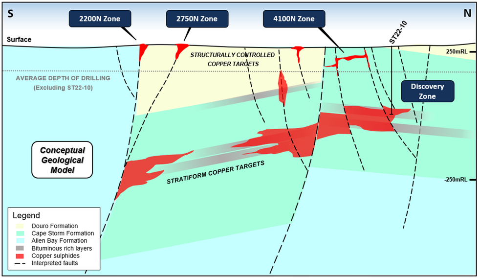 Figure 8: Conceptual geological and exploration targeting model for the Storm Project, showing depth of current drilling and conceptual location of discovery drill hole ST22-10.
