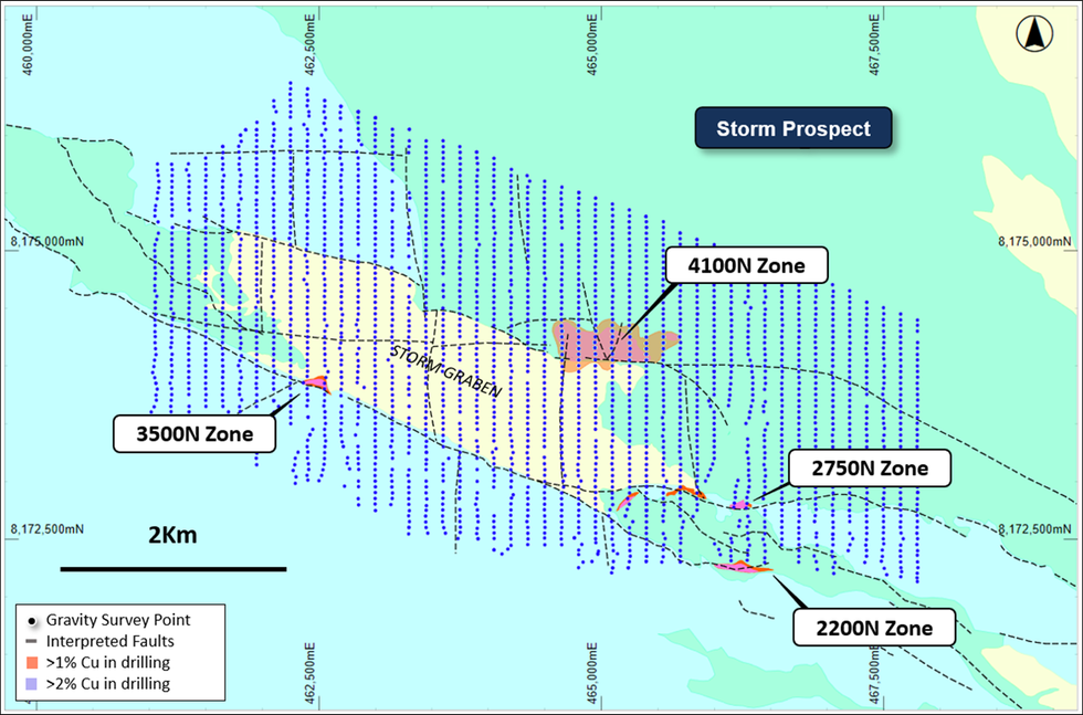 The ‘northern fault' gravity anomaly extends over approximately 4.8km, is located to the north of the main fault, and is broken into two main zones. The easternmost zone is located directly below the 4100N Zone, where ongoing drilling has defined thick and continuous copper mineralization in the near-surface (<100m depth) over 1km of strike.