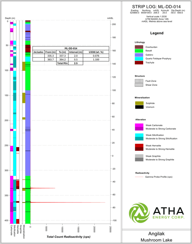 Drillhole ML-DD-014 (Figure 6), which intersected total composite mineralization1 of 2.5 m, from 335.3 m down to a depth of 364.2 m, including an intersection of high-grade mineralization2 of 1.10% U3O8 over 0.5 m;