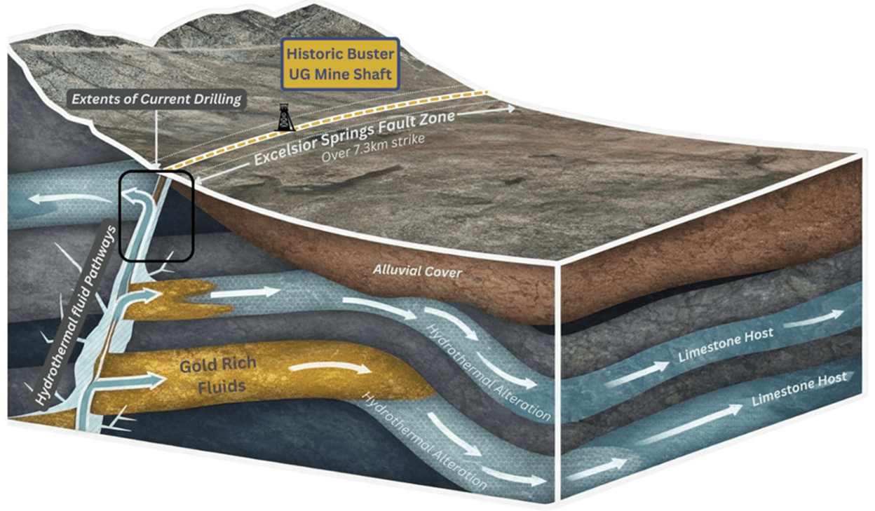 Figure 1: Schematic of Carlin-type gold deposit model at Buster Trend, Excelsior Springs (source: Mammoth Minerals).