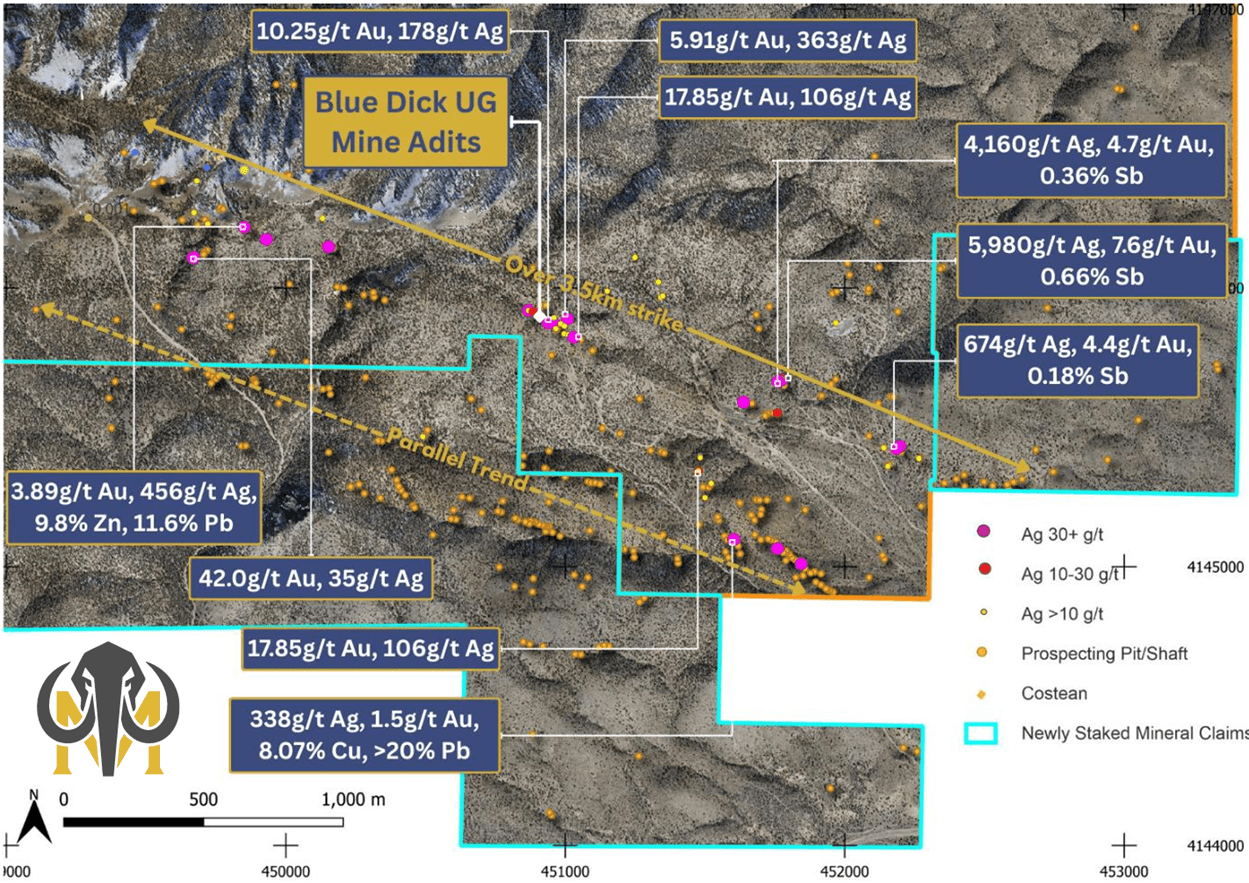 The silver-rich polymetallic Blue Dick Zone has been further expanded, extending the known mineralized trend to over 3.5 km, with evidence for multiple untested parallel trends supported by newly staked tenure and extensive historical workings mapped from LiDAR, following up on previously reported rock chip results: