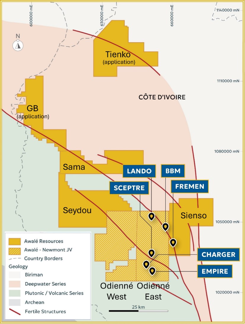 Awalé is a diligent and systematic mineral exploration company focused on discovering large high-grade gold and copper-gold deposits. Exploration activities are currently underway in the underexplored regions of Côte d'Ivoire, where the Company is exploring the Odienné Copper-Gold Project ("Odienné" or the "Project"), covering 2,346 km2 across seven permits-five granted and two applications. This includes 797 km2 in two permits held under the Awalé-Newmont Joint Venture ("OJV"). Awalé manages all exploration activities over the OJV, with funding provided by Newmont Ventures Limited ("Newmont").