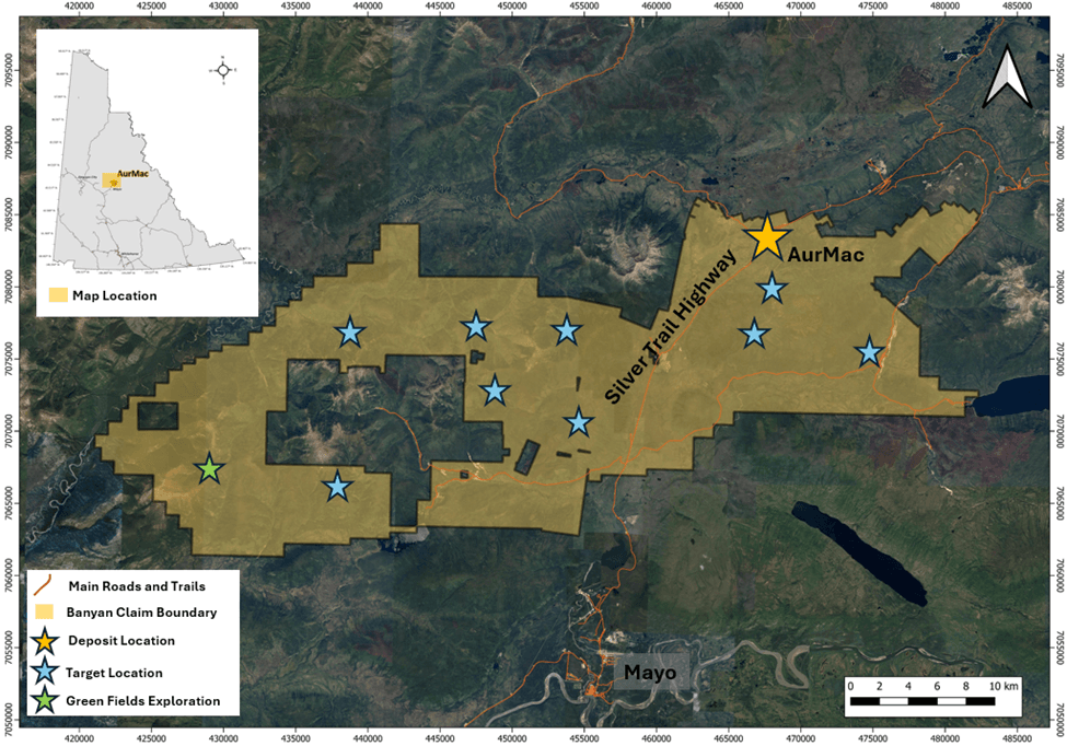 Banyan's primary asset, the AurMac Project is located in the Traditional Territory of First Nation of Na-Cho Nyäk Dun, in Canada's Yukon Territory. The current Mineral Resource Estimate ("MRE") for the AurMac Project has an effective date of June 28, 2025 and comprises an Indicated Mineral Resource of 2.274 million ‎ounces of gold (" Au ") (112.5 M tonnes at 0.63 g/t) and an Inferred Mineral Resource of 5.453 Moz of Au (280.6 M tonnes at 0.60 g/t ) (as defined in the Canadian Institute of Mining, Metallurgy and Petroleum ("CIM") Definition ‎Standards for Mineral Resources & Mineral Reserves incorporated by reference into NI 43‑101). The 303 square kilometres ("sq km") AurMac Project lies 40 kilometres from Mayo, Yukon. The AurMac Project is transected by the main Yukon highway and benefits from a 3-phase powerline, existing power station and cell phone coverage.