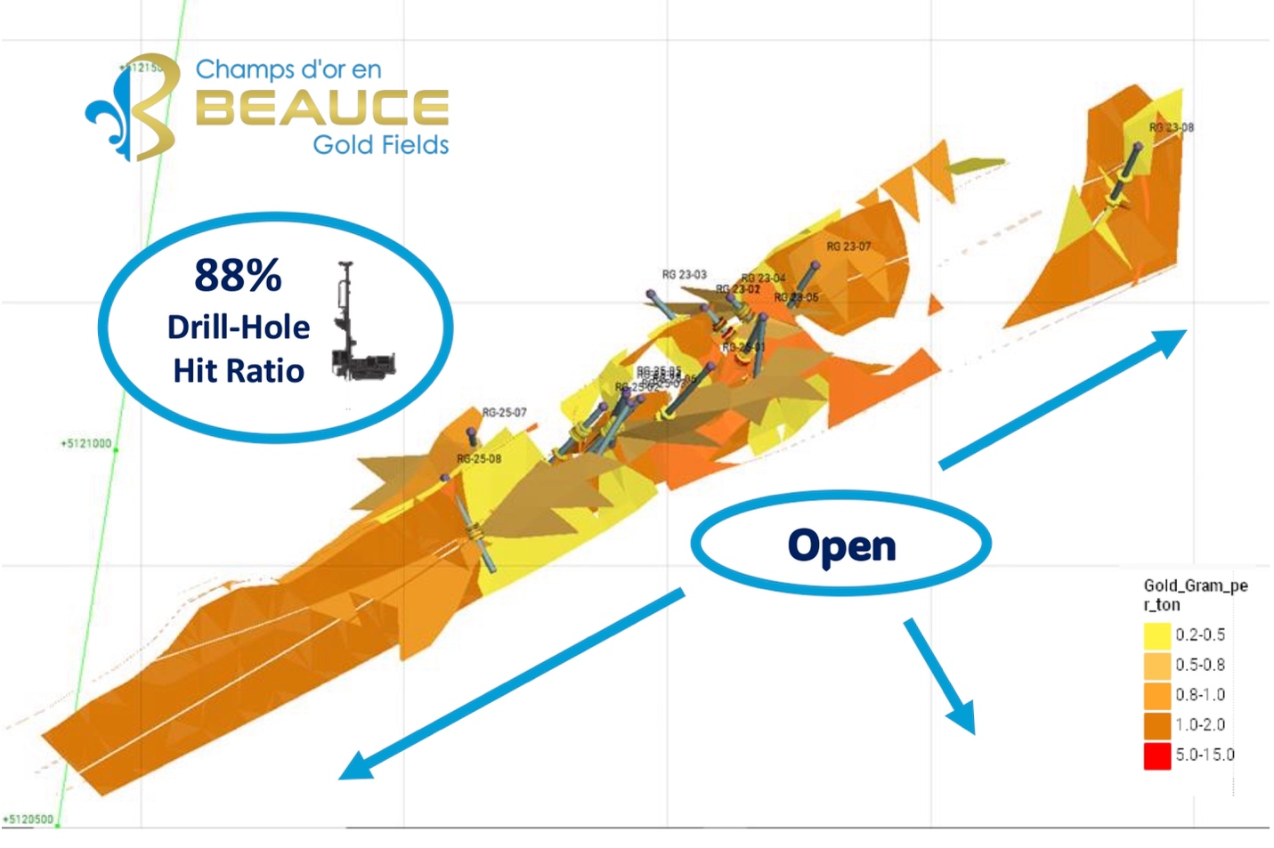 December 17, 2025 TheNewswire - Montreal, Quebec, Canada - Beauce Gold Fields (Champs d'Or en Beauce) (TSX Venture: BGF), referred to as "BGF" or the "Company," is pleased to announce a major advancement in understanding the gold-bearing Grondin Zone with the completion of a Leapfrog™ 3-D geological model integrating drill data from the 2023 and 2025 diamond drill campaigns. The new model provides the first three-dimensional visualization of the antiform–saddle reef mineralized system that the Company has previously traced along an 8-km geophysical signature and drilled over a strike length of 600 metres. Patrick Levasseur, President and CEO of Beauce Gold Fields, stated: "This Leapfrog 3-D model is a major milestone for Beauce Gold Fields. For the first time, we can visualize the geometry of the gold-bearing saddle-reef structure in three dimensions and clearly see the continuity of mineralization along more than 600 metres. Achieving an 88% drill success rate across two campaigns gives us tremendous confidence. This model will greatly improve our drill targeting this winter and positions us for an exciting next phase of exploration."