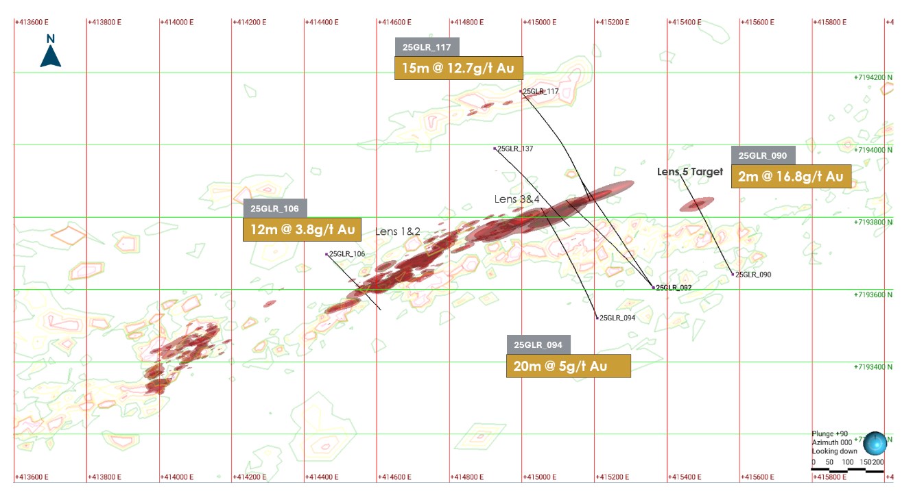 - 20m at 5g/t gold from 676m 25GLR094 (building out Lens 4 to the 90m to the west).
