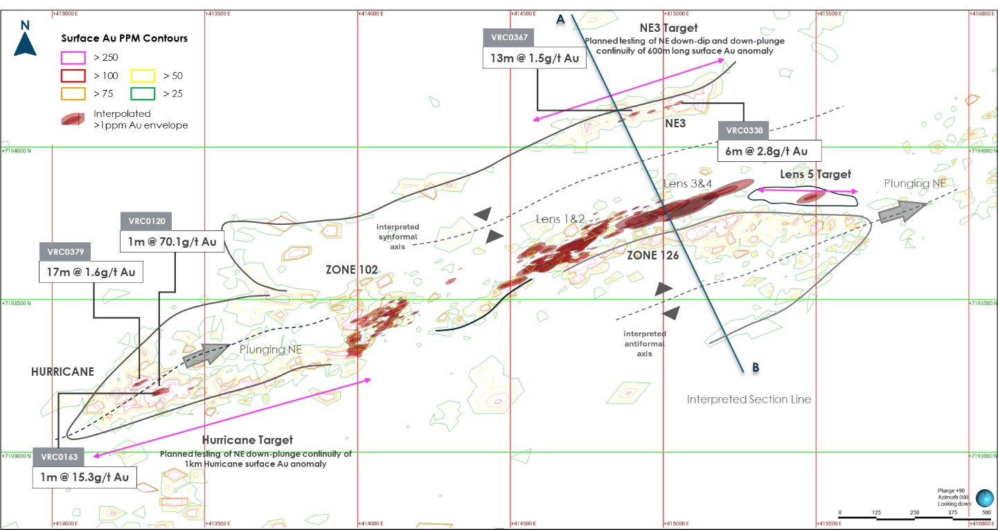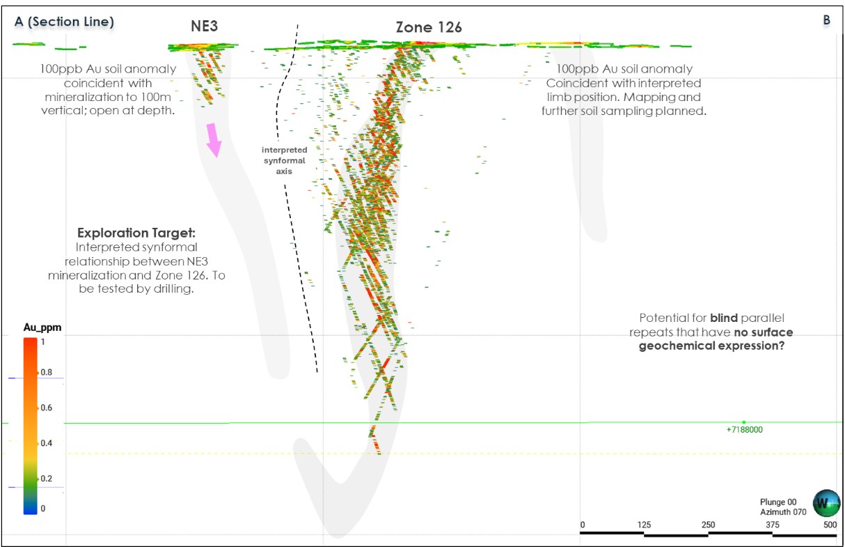 The NE3 target is being tested as an interpreted opposing (NE) fold limb to Zone 126, while Hurricane represents a 1 km long +100 ppb gold-in-soil anomaly located at the interpreted synformal hinge position along strike to the SW. Critically, the NE3 and Hurricane targets have coherent >100 ppb gold-in-soil anomalies; the same surface signature that has accompanied every high-grade lens discovered at Zone 126 to date.