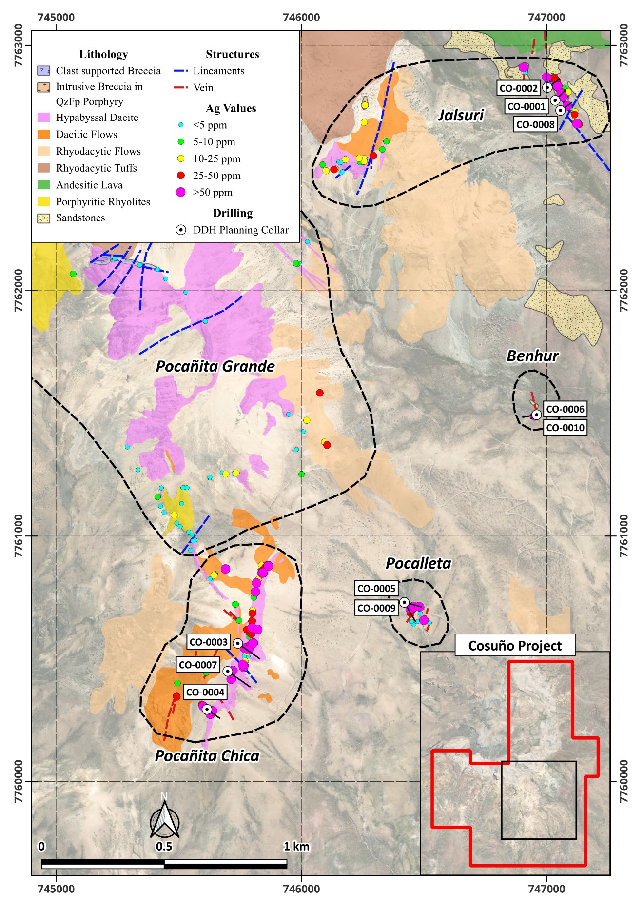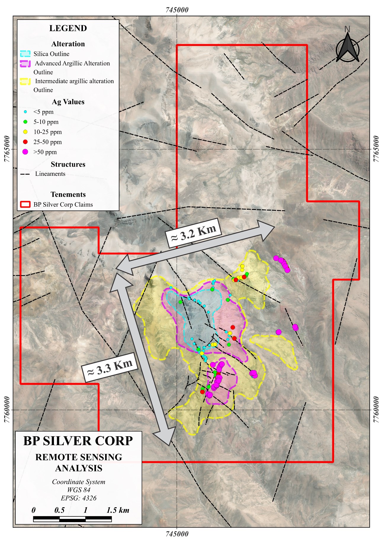 - Large untested silver rich hydrothermal system which outcrops over ~10.5 km2 (Figure 1).
