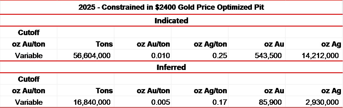 RESPEC Company, LLC utilized the approximate 3-year trailing-average, base-case price of US$2,400 per ounce of gold and $28.80 per ounce of silver to update the pit-constrained resource tabulated below.