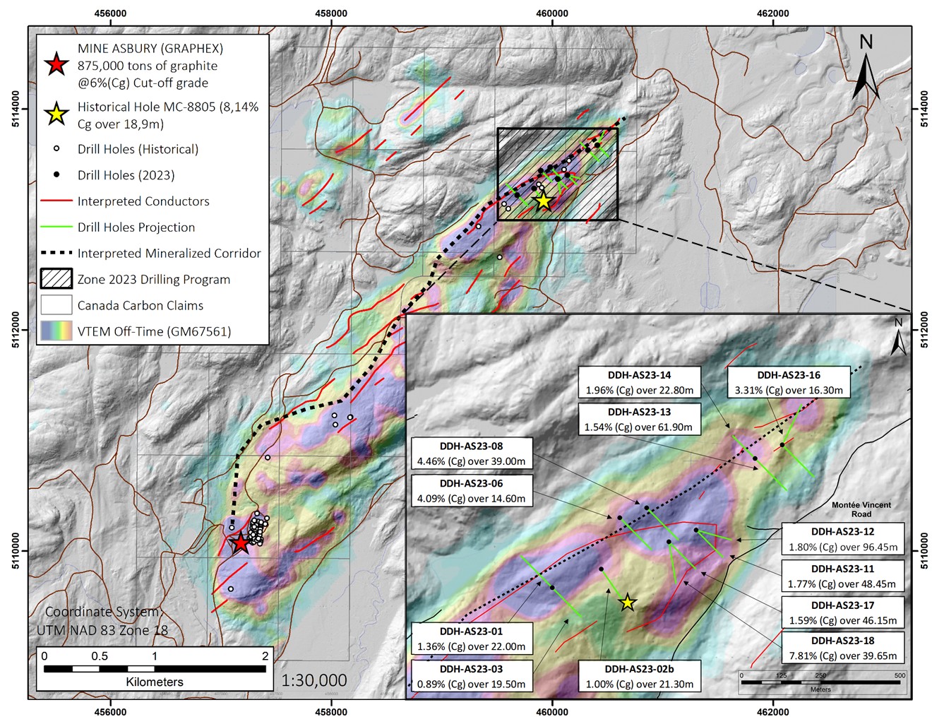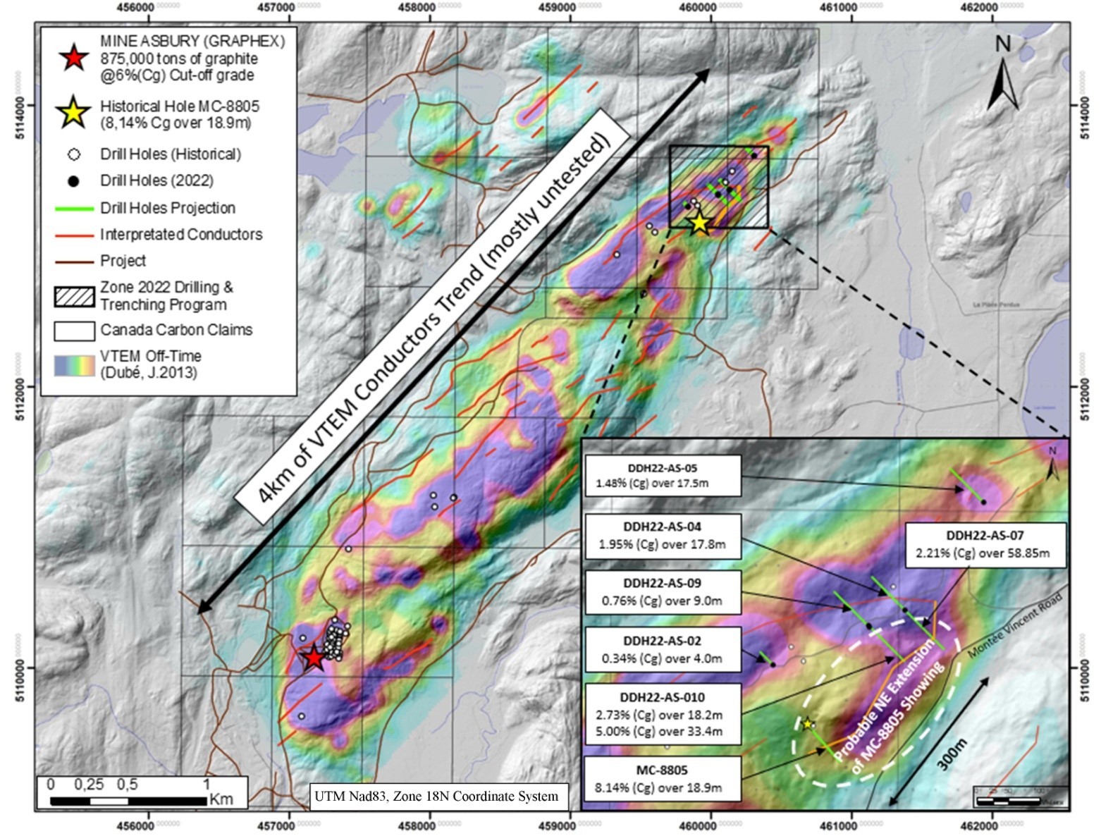 The results from the Company's Fall 2022 Drill Campaign were equally impressive, enabling CCB to report graphite grade results in the eastern part of the Deposit of up to 2.21% (Cg) over 55.85m including 9.21% over 7.25m in hole DDH-AS22-07; and 5% Cg over 33.5m including 8.57% (Cg) over 13.5m (see figure 3 and Press Release dated February 15th, 2023).