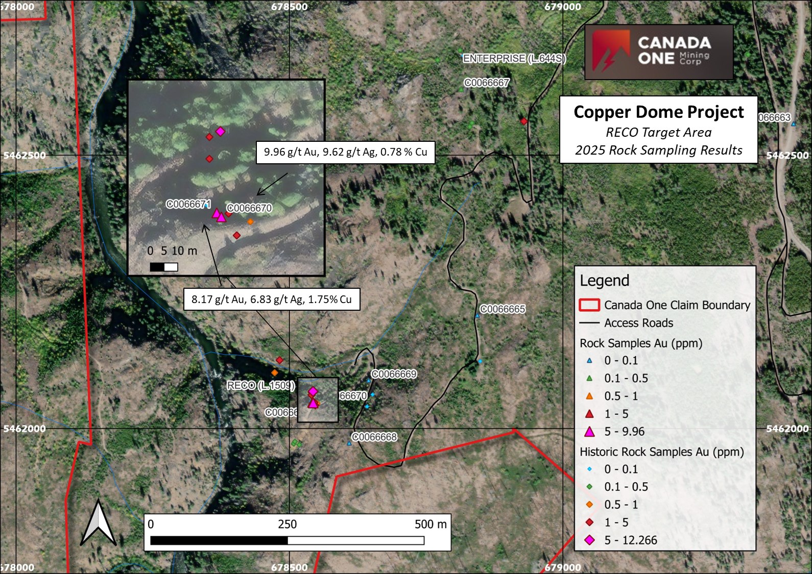 Canada One Mining Corp. (TSXV: CONE,OTC:COMCF) (OTC Pink: COMCF) (FSE: AU31) ("Canada One" or the "Company") is pleased to report high-grade gold results, accompanied by copper and silver values, from the Reco target at the Copper Dome Project, ("Copper Dome", "Project" or "Property") located adjacent to the Hudbay Minerals Inc. producing Copper Mountain Mine, Princeton, B.C.