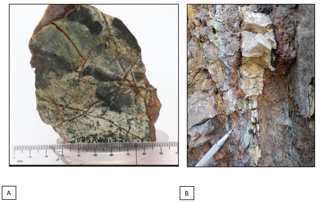 Figure 1: (A) Rock sample C0066671 from the RECO target, showing mineralized sedimentary wall rock adjacent to a mineralized shear zone. The sample returned assays of 8.17 g/t Au, 6.83 g/t Ag, and 1.75% Cu.