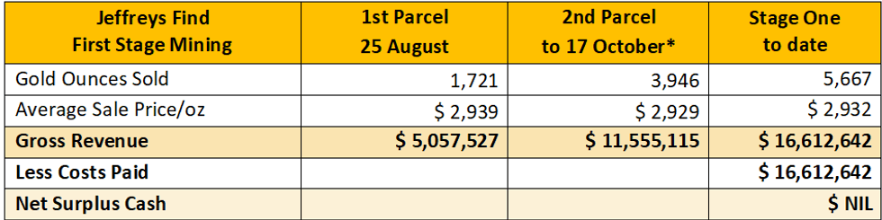 Auric Mining Limited (ASX: AWJ) (Auric or the Company) is pleased to update the ASX on Stage One mining from the Jeffreys Find Gold Mine near Norseman. As at Sunday 15 October 2023, more than 7,700 ounces of gold have been produced. As at Tuesday 17 October 2023, 5,667 ounces have been sold generating gross revenue of $16,612,642.