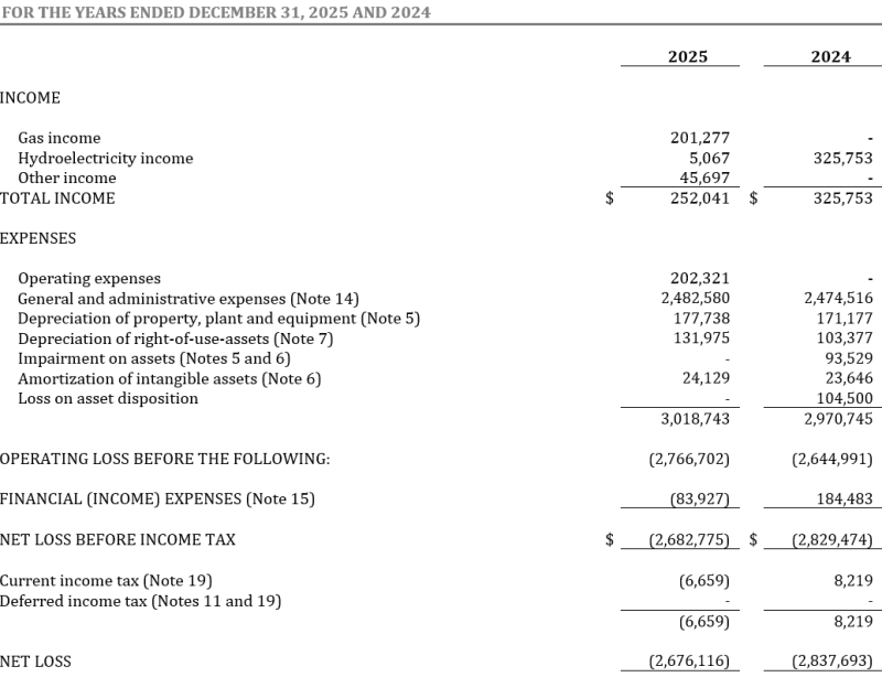 Les revenus liés au gaz se sont élevés à 201 277 $ en 2025 (aucun en 2024).