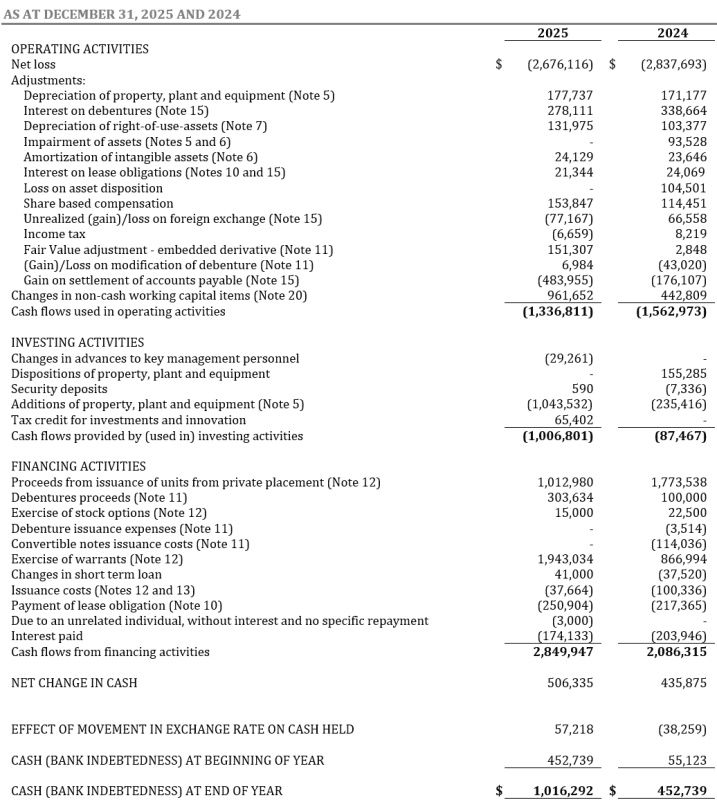 La Société a clôturé un placement privé de 1 012 980 $, des unités en règlement de dettes de 1 776 827 $, des actions en règlement de dettes au management de 310 000 $ et des exercices de bons de souscription totalisant 1 943 034 $ (866 994 $ en 2024) et 303 634 $ supplémentaires en obligations convertibles.