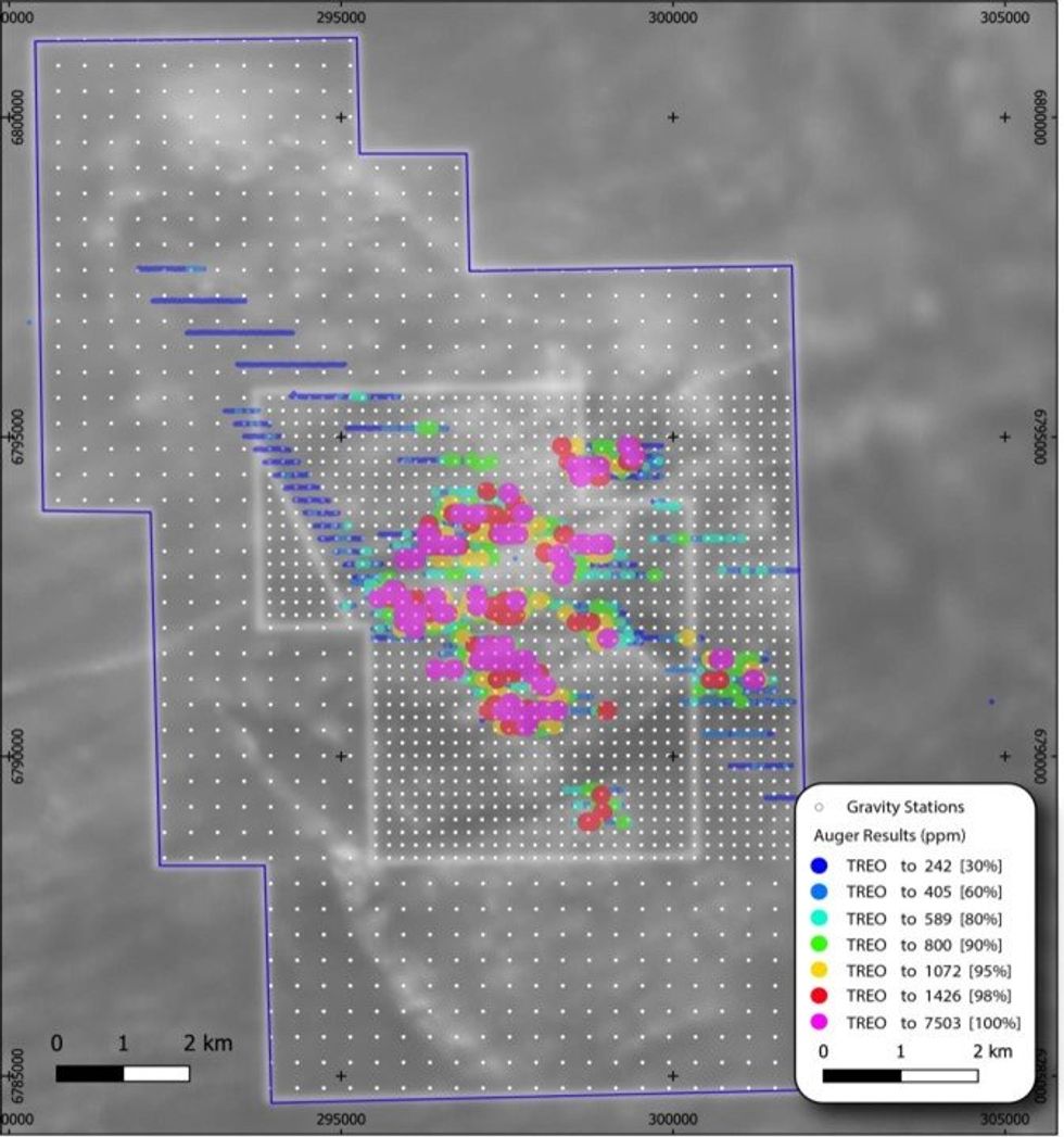 - Gravity survey aims to identify source of surficial values up to 7,503ppm TREO associated with previously unrecognised REE-bearing dykes.
