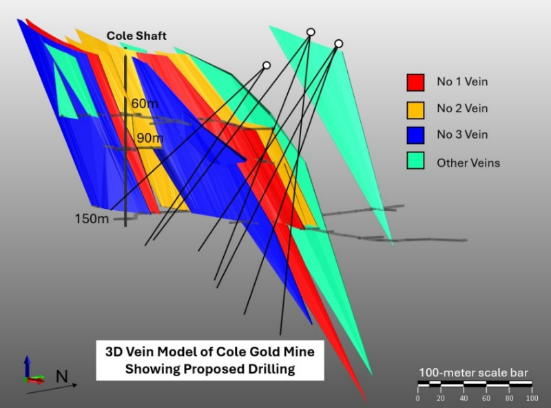 In late 2025, veins at the Cole Gold mine were modelled in 3D using historic underground mine maps. Historic drilling shows gold mineralization extends to a vertical depth of 320 meters and is open at depth. High-grade shoots have been identified, which are the primary focus of the planned 2,500m drill program (Area 1).