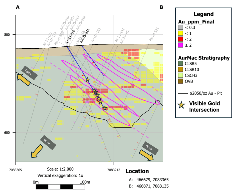 AX-25-819 - 1.82 g/t Au over 26.2m and 4.64 g/t Au over 7.7m, within 1.06 g/t Au over 49.6m; includes high-grade interval of 19.90 g/t Au over 1.5m;