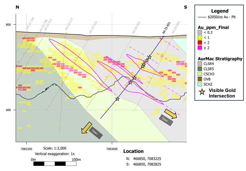 AX-25-801 - 1.70 g/t Au over 5.8m, within 0.79 g/t au over 20.4m; includes high-grade interval of 14.10 g/t Au over 0.4m;