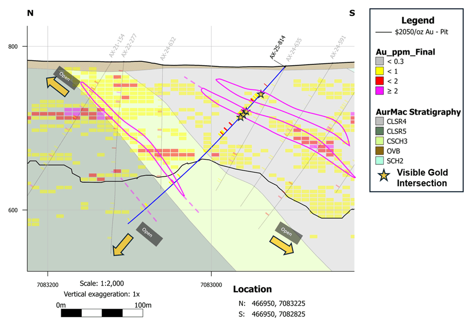 AX-25-814 - 1.57 g/t Au over 6.6m, within 0.39 g/t Au over 98.6m