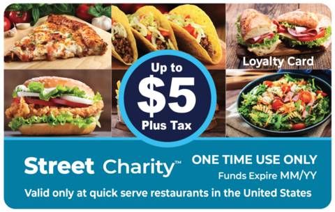 - Paper prepaid payment cards are redeemable for food at chain restaurants, giving donors peace of mind and recipients the dignity to choose their own food