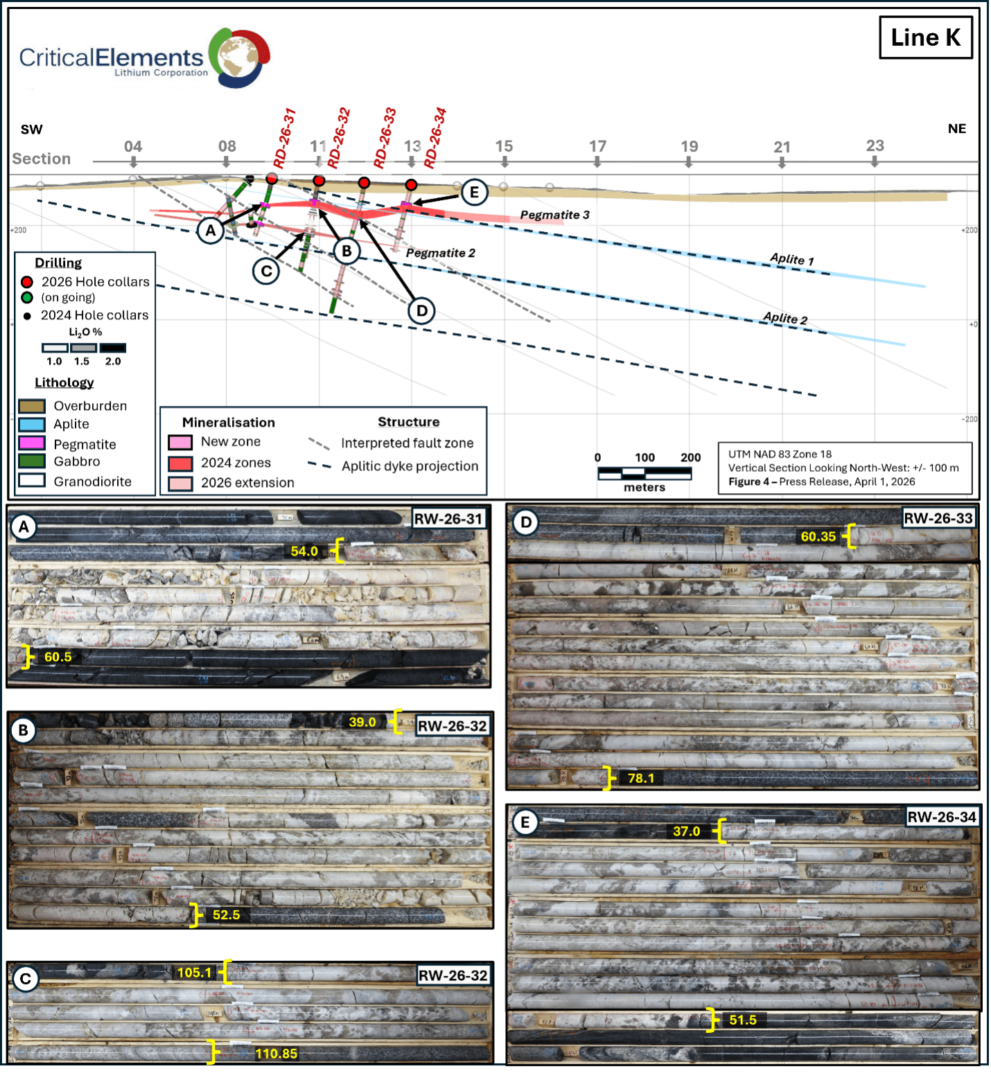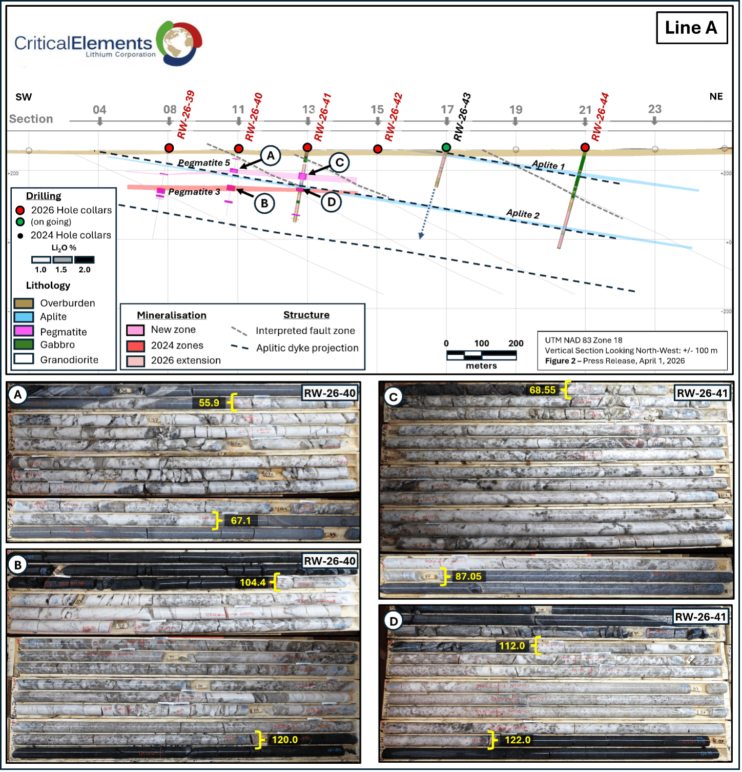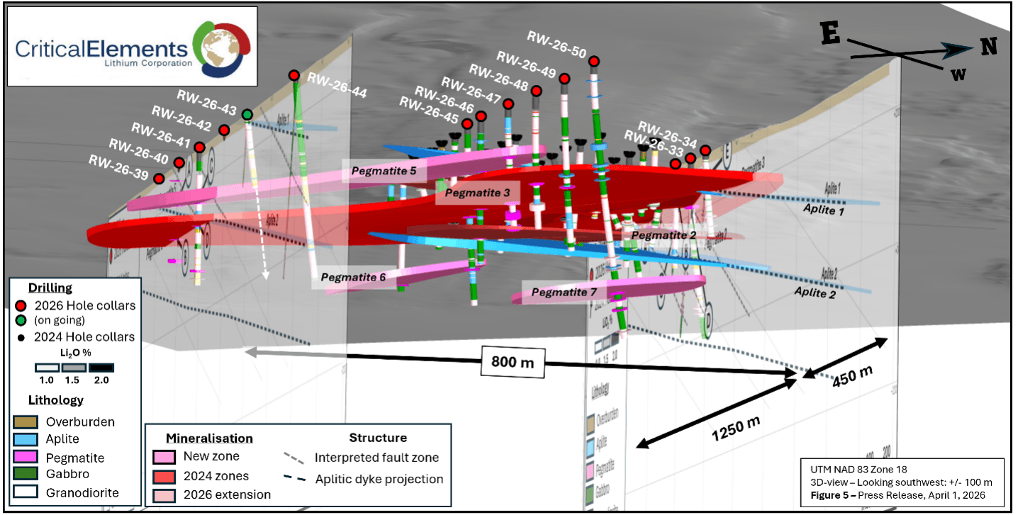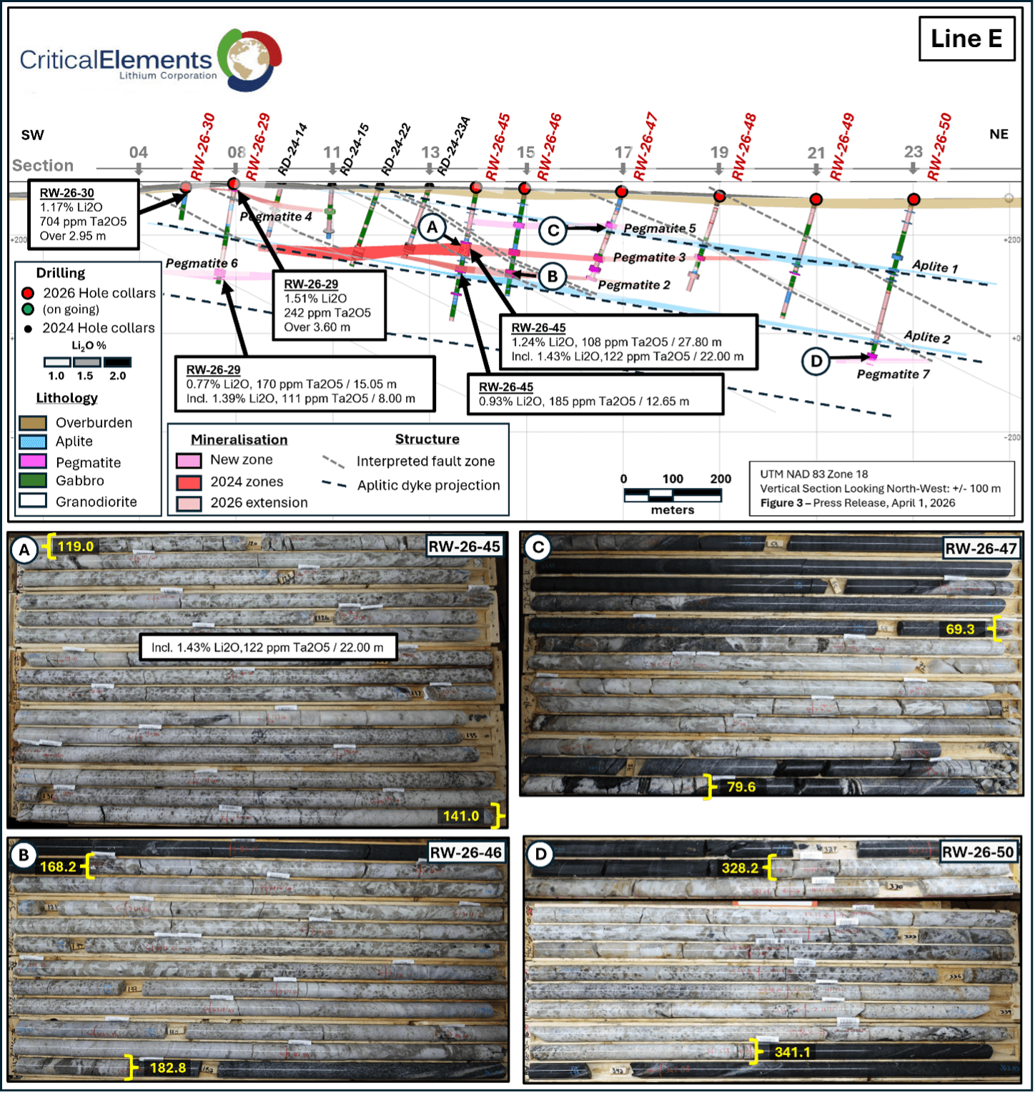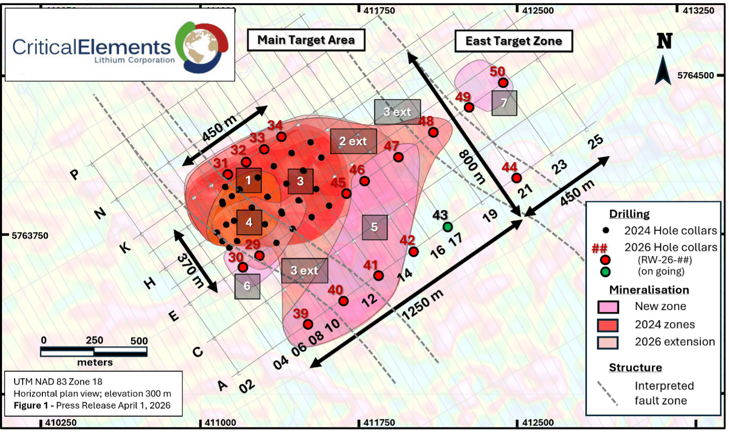 MONTRÉAL, QC / ACCESS Newswire / April 1, 2026 / Critical Elements Lithium Corporation (TSX-V:CRE)(OTCQX:CRECF)(FSE:F12) ("Critical Elements" or the "Corporation") is pleased to provide an update on its Phase 1 Winter 2026 drill program, at the 100% owned Rose West Discovery ("Rose West"), located in Eeyou Istchee, Québec. Rose West is situated within 10 km of the highly advanced Rose Lithium-Tantalum Project ("Rose"). Rose West was previously documented as a near surface, sub-horizontal 10-40 m thick lithium-rich pegmatite bearing zone intercepted by drilling over a 450 m x 370 m footprint area in the winter of 2024 (see Press Release dated February 3, 2026). Recent drilling confirms the presence of spodumene rich intervals all around the initial core zone, and especially towards the East Target area, extending the main pegmatite body by about 800 meters towards the east and by about 400 meters to the south, thus bringing its overall footprint to 1250 m x 800 m. Furthermore, the recent drilling has identified three (3) new spodumene-bearing pegmatitic bodies within the target area; a significant addition to the working model as it could potentially lead to rapid growth of the mineral inventory within the footprint of the project.