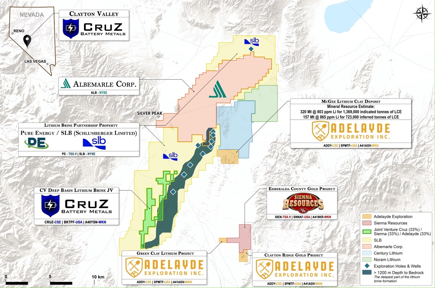 Cruz Battery Metals Corp. (CSE: CRUZ,OTC:BKTPF) (OTCID: BKTPF) (WKN: A40YSN) ("Cruz" or the "Company") is pleased to announce that it has entered into a joint venture agreement ("JV") with Sienna Resources Inc. ("Sienna") and Adelayde Exploration Inc. ("Adelayde") to explore the deep basin lithium brine potential in Clayton Valley, Nevada. The 115 mineral claims comprising the 2,300-acre JV land package are all located within, and completely surrounded by, SLB's (formerly Schlumberger) and Pure Energy Minerals' lithium deposit (see map below). Clayton Valley, Nevada is home to the only long-established producing lithium brine basin in the U.S., Albemarle's Silver Peak lithium brine mine, which extracts lithium from subsurface brines. It has been the sole U.S. producing lithium brine operation since the 1960's.