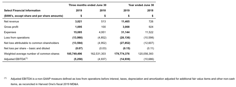 Harvest One Cannabis Inc. today announced the release of its financial and operating results for the three and twelve months ended June 30, 2019.