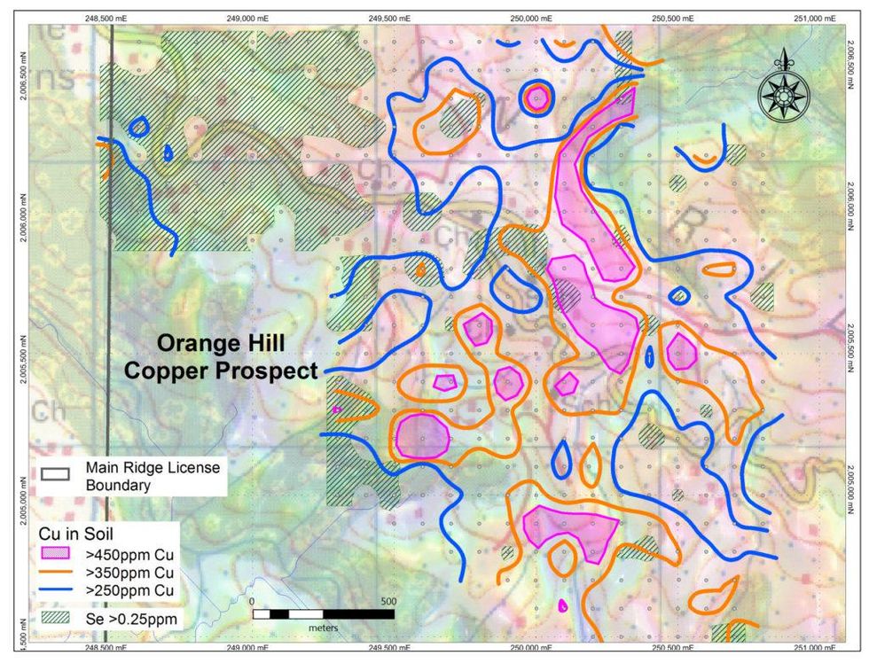 Prospect Soil samples were collected from 350 sites on a 100m square grid, covering a 3.7 sq. km. area in the west part of the Main Ridge License. Results from the soil sampling indicated two, possibly three, large distinctive areas marked by anomalous results for numerous elements. The results from each area imply the presence of separate underlying mineralization systems. The geochemical results also suggest the presence of epithermal veining and mineral enhancement (overprinting).