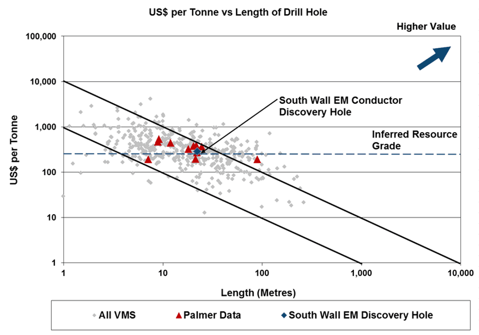 - In 2009, prior to reporting a number of high-grade intersections, the company outlined a 43-101 compliant inferred resource of 4.75 million tonnes grading 1.84 percent copper, 4.57 percent zinc, 0.28 g/t gold and 29 g/t silver using a $50-per-tonne cut off ($700 gold, $12 silver, $2.25 copper, $0.85 zinc). Initial metallurgical work indicated coarse-grained sulfide and simple mineralogy. The Palmer VMS project, discovered in 1969, is well situated on a paved Alaskan state highway 60 kilometers from the year-round sea port at Haines, Alaska. The company expects to have an updated resource in early 2015.