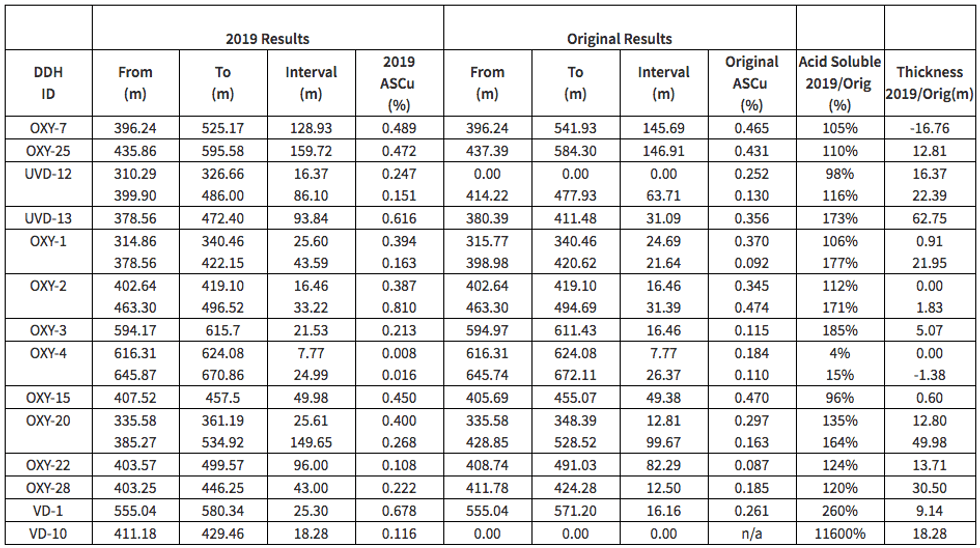 The following table shows the comparison of the ASCu concentrations and thickness of the mineralized intervals for 14 of the 25 holes sampled.