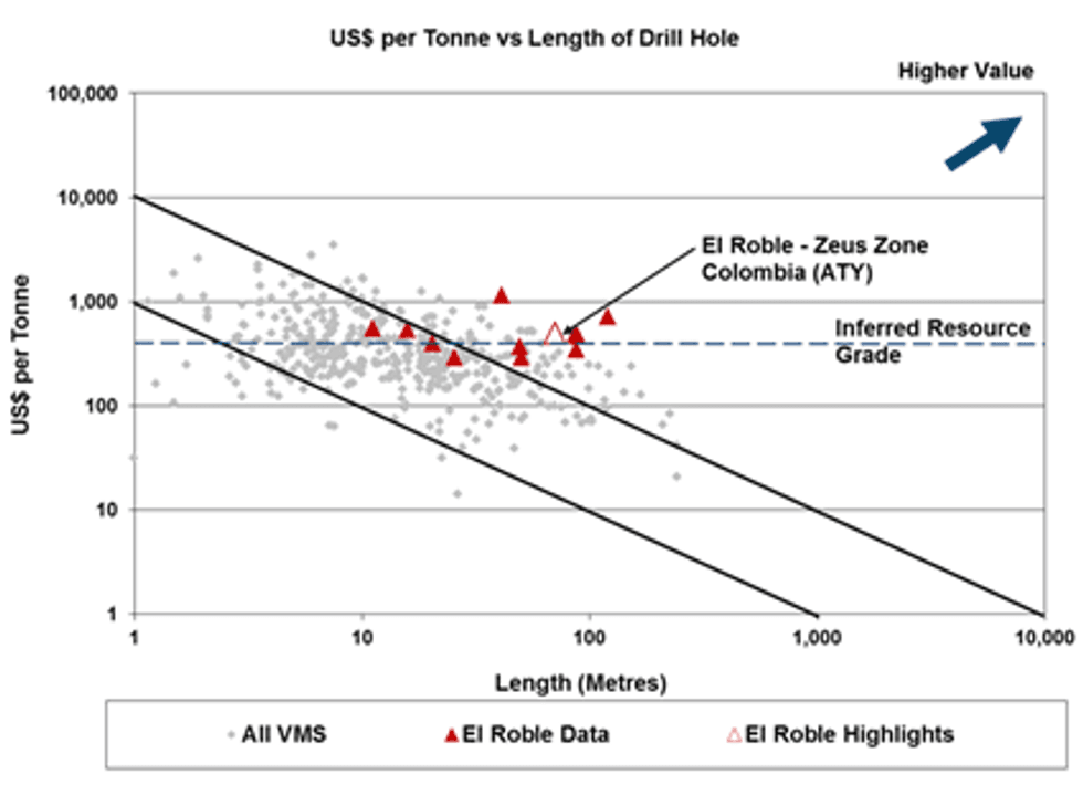 Atico Mining announced infill drill results from the recent Zeus massive sulfide discovery at its El Roble VMS deposit in Colombia. The mineralization is outside of the resource shell as defined in the June 2013 inferred resource.