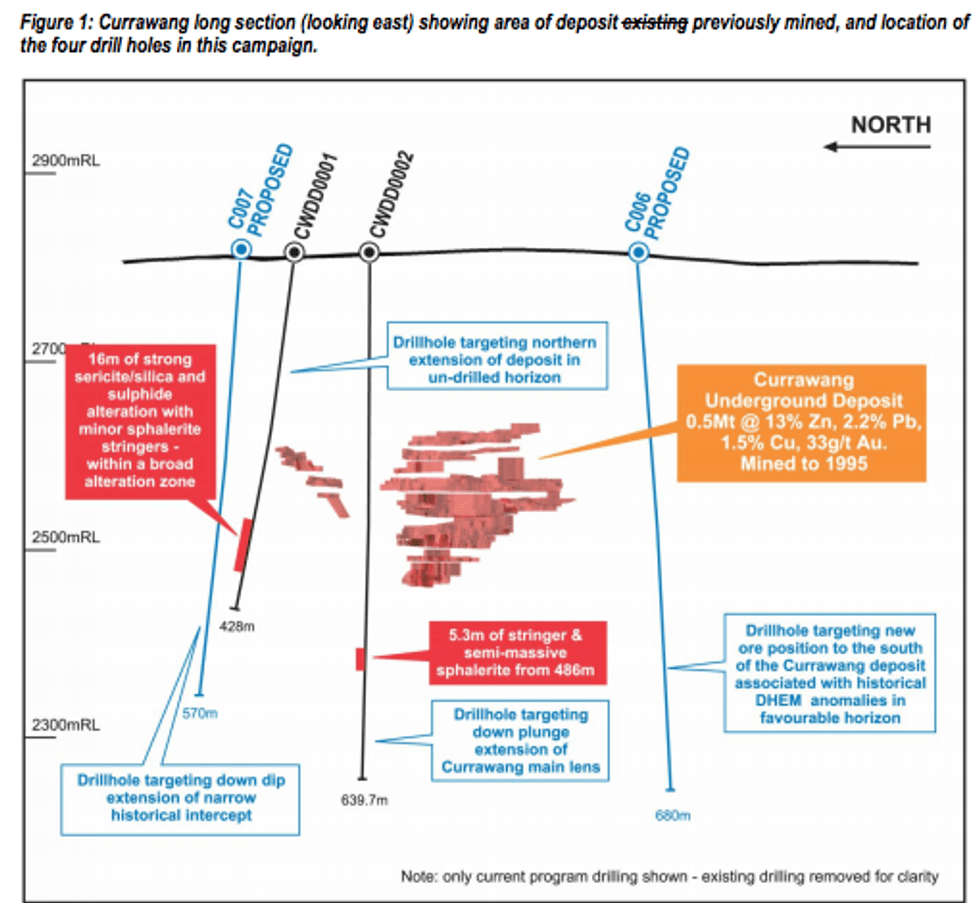 The first hole (CWDD0001) targeted the along-strike extension to the north of the main Currawang Lens (Figure 1) in an area of limited historic drilling. This hole intersected a broad interval (38m, from 341m down-hole) of moderate to intense sericite, silica, pyrite, and chlorite alteration within a strongly foliated, and in-part, brecciated basalt (the Currawang Basalt). Within this interval is 16m of intense alteration and minor stringers of zinc sulphides with lesser lead and copper sulphides. These stringers sulphides are analogous to, and represent, the mine horizon; as well, the intensity of the alteration indicates potential proximity to high-grade mineralisation.