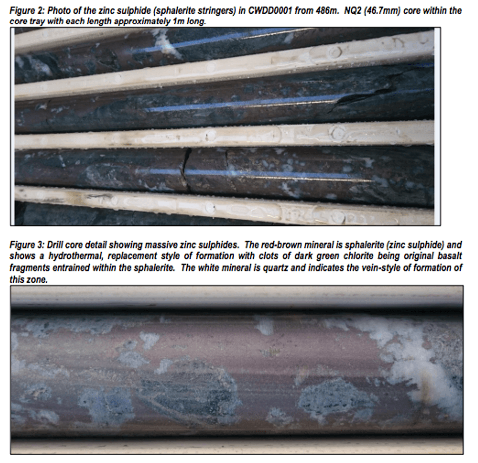 - Hole CWDD0002, targeting below the known main lens, intersected 5.3m of semi-massive and stringer-style zinc and copper sulphide mineralization from 486m down-hole. This is interpreted to represent a new zone (lens?) of significant mineralisation directly to the east and below the main lens.