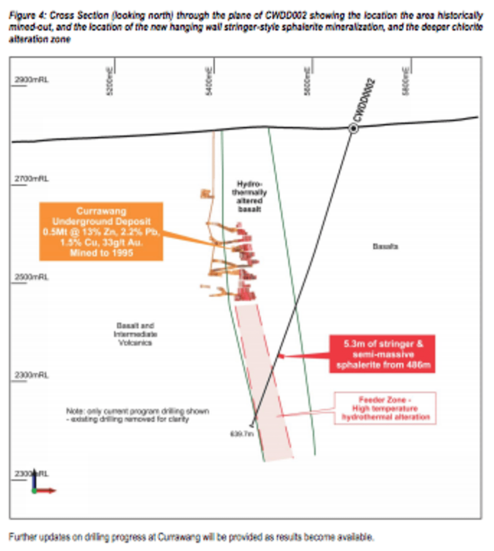 The second drill hole (CWDD0002) targeted the down-plunge extension to the main Currawang Lens (Figure 1) and intersected 5.3m of 5-10cm stringers and semi-massive zinc sulphide mineralization (Figures 2 and 3) from 485.7m within a broad zone of alteration hosted by the basalt sequence. Copper sulphides within this zone are probably responsible for the weak, historic DHEM anomaly measured in this area.