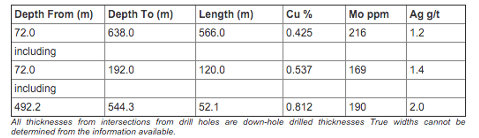 The overall assay results from a depth of 130.0 metres to a depth of 379.0 metres, the end of the sequence that has been assayed, had a total length of 249.0 metres with an average grade of 0.736 % Cu, 178 ppm Mo and 1.4 g/t Ag.
