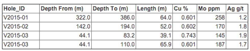 The drilling intersected long sequences of greater than 0.6 % Cu with significant Mo and Ag credits.
